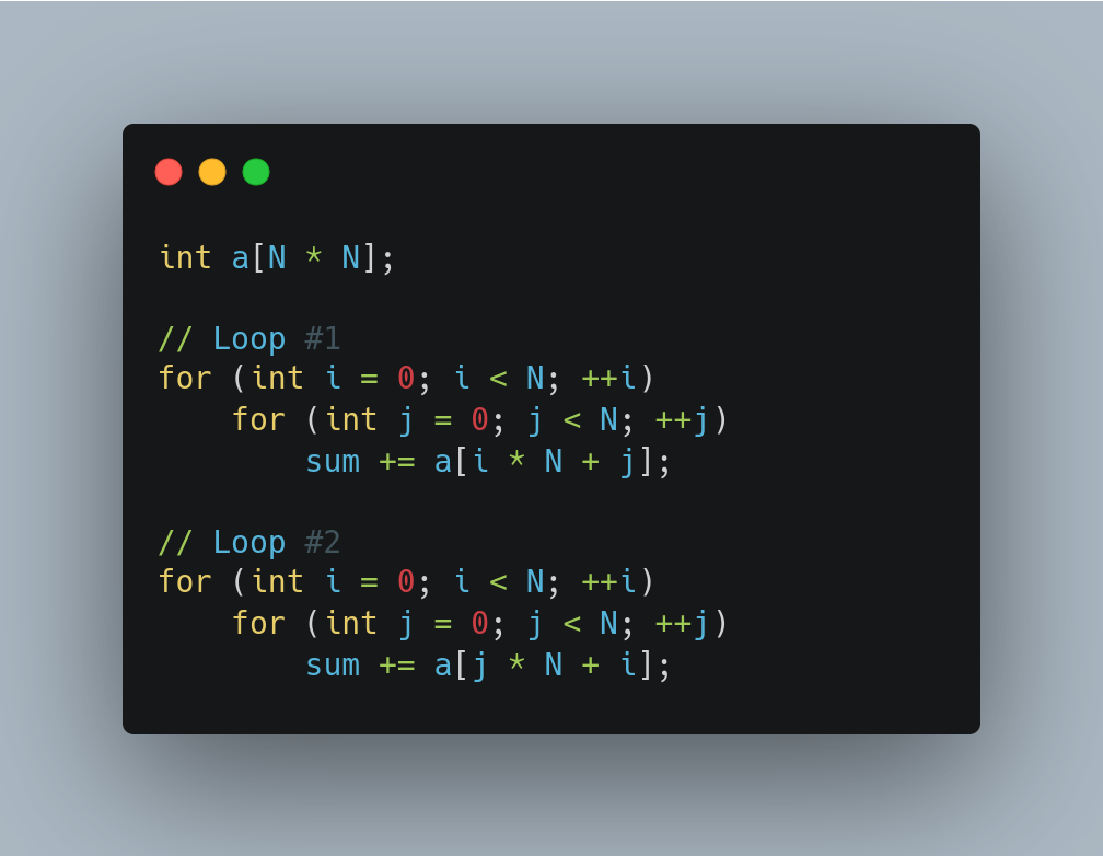 The first loop accesses the memory sequentially from the beginning to the end of the array. The second one skips N steps between 2 iterations. Which one is faster?